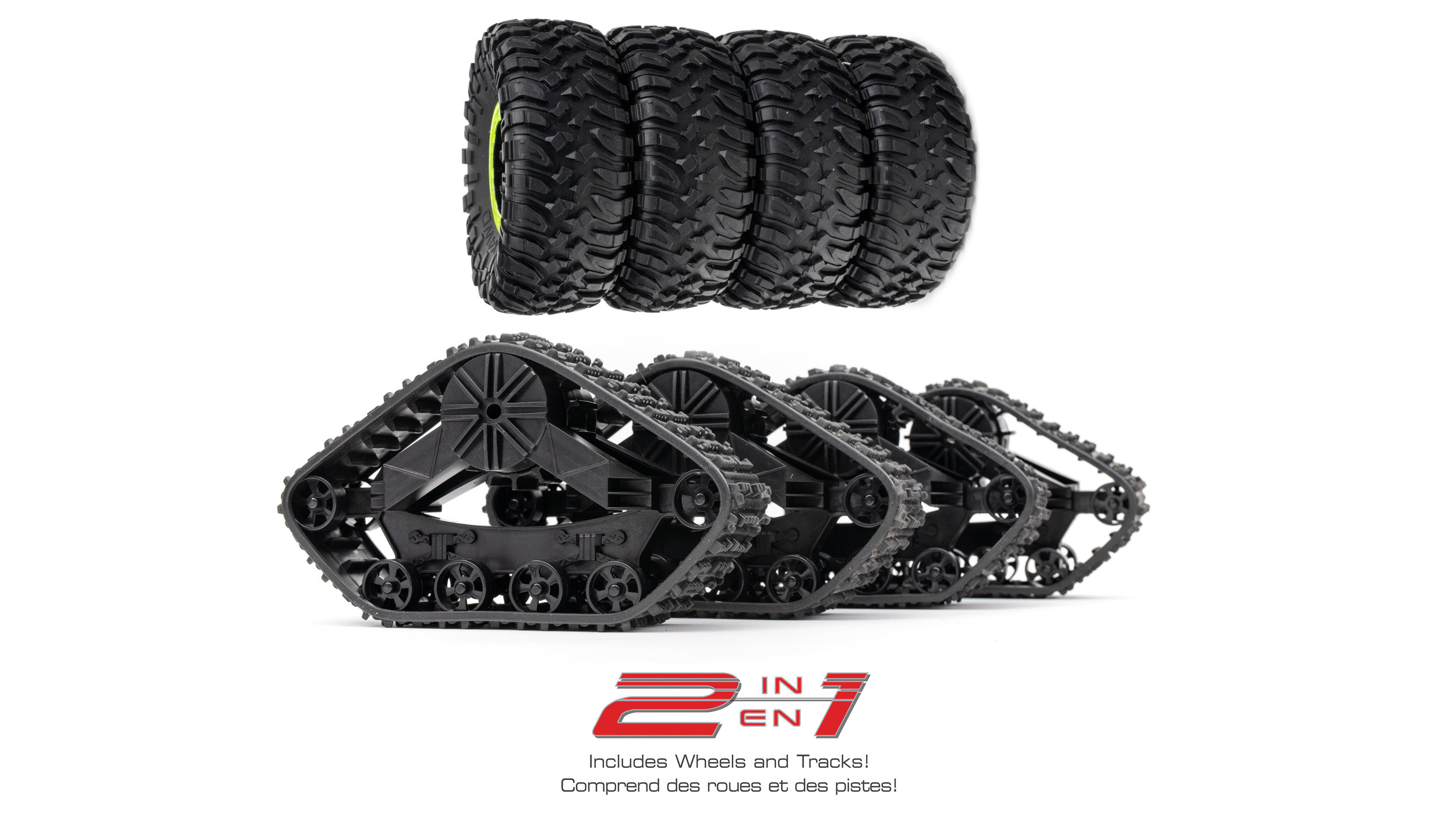 Put on the All-Terrain Wheels for some high speed fun over light terrain! Attach the tracks to tackle rough, impassible environments like snow and mud.